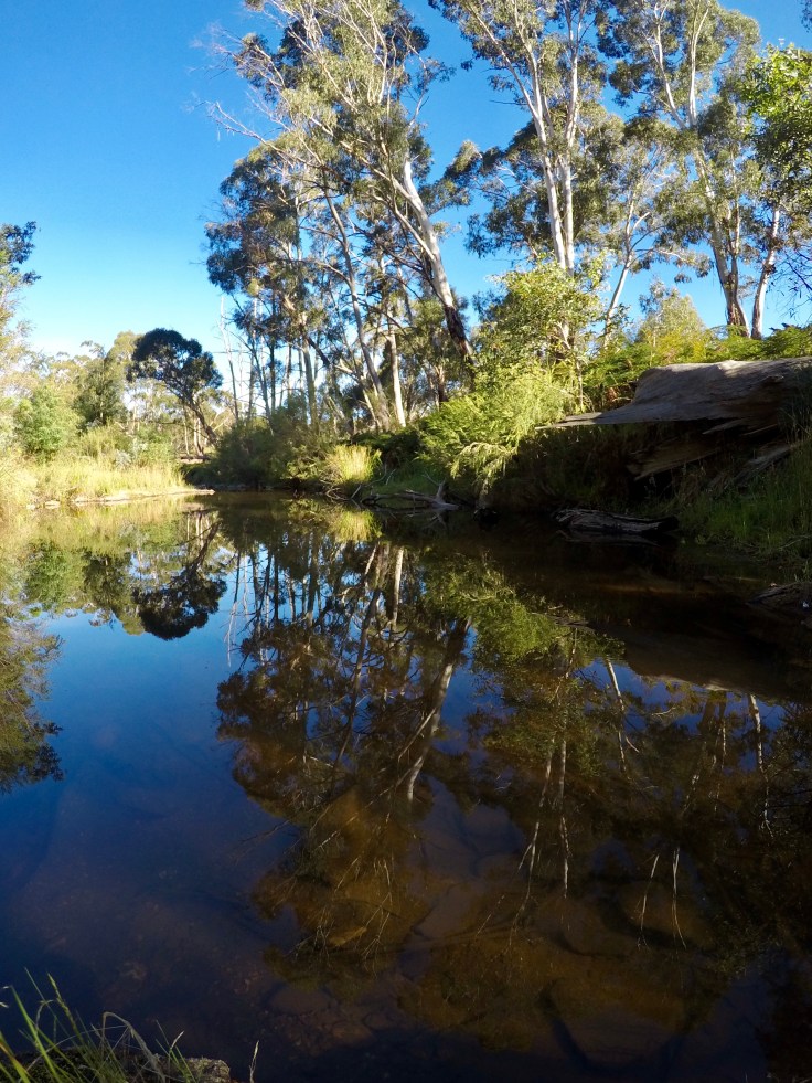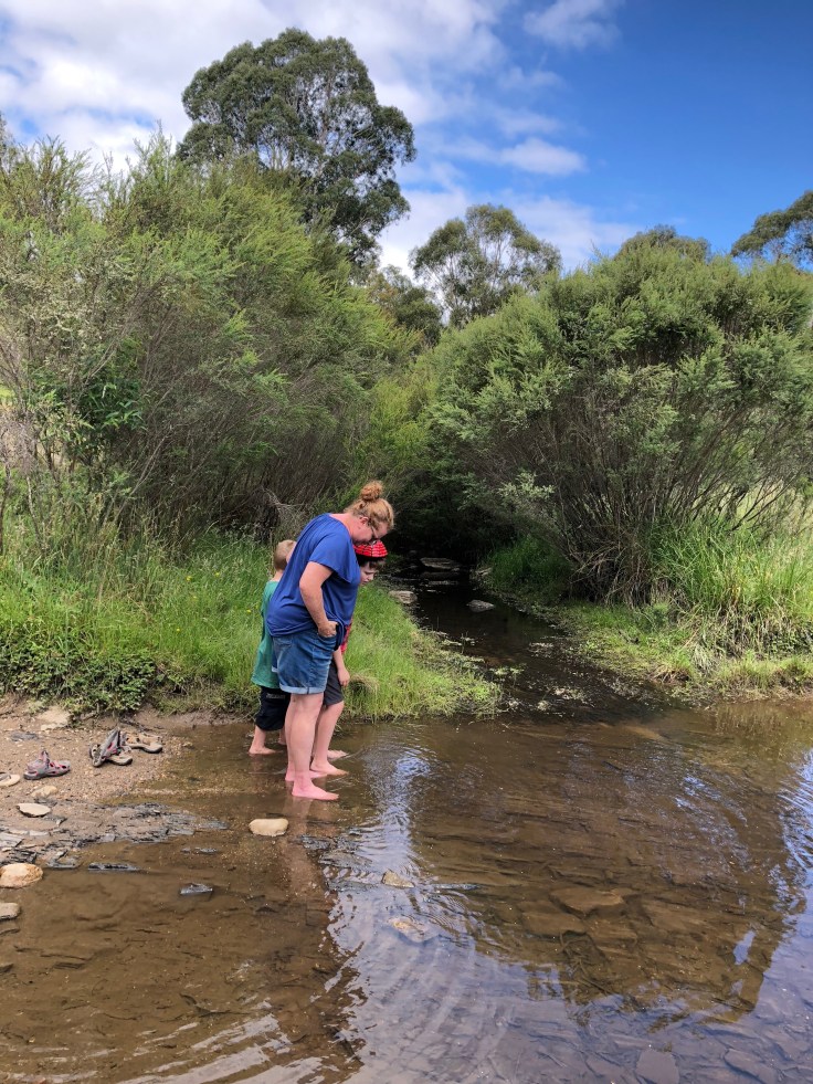 We had a couple of close calls with snakes, stirring up a large black snake near the creek. Our youngest had a bush spider as big as the palm of my hand crawl up onto his shoulder. That event caused a sleepless night for the wee man, and the rest of us that had to calm him down. All forgotten by the next day though, when he climbed into the branches again. The wombats checked us out during the night, zooming under our feet on late night trips to the toilet. Man those little guys can move for something built like a barrel.