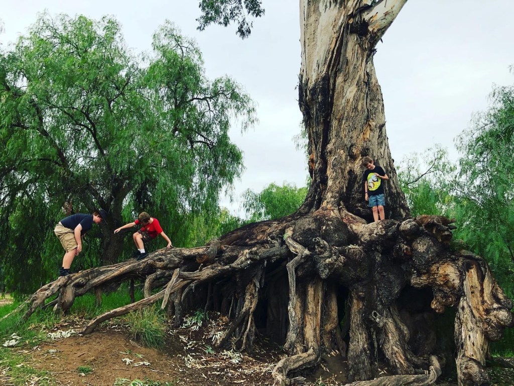 Just on the edge of Bingara (NSW) next to the river, there is a tree. It stands atop its own roots, underneath is enough room for small humans to make a little home, you could walk all the way through under it! It’s like a little hut built by nature, and it put me in mind of Harry Potters’ whomping willow.