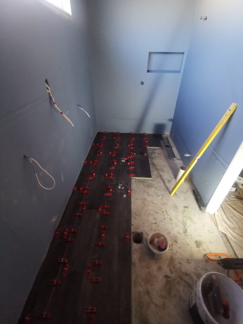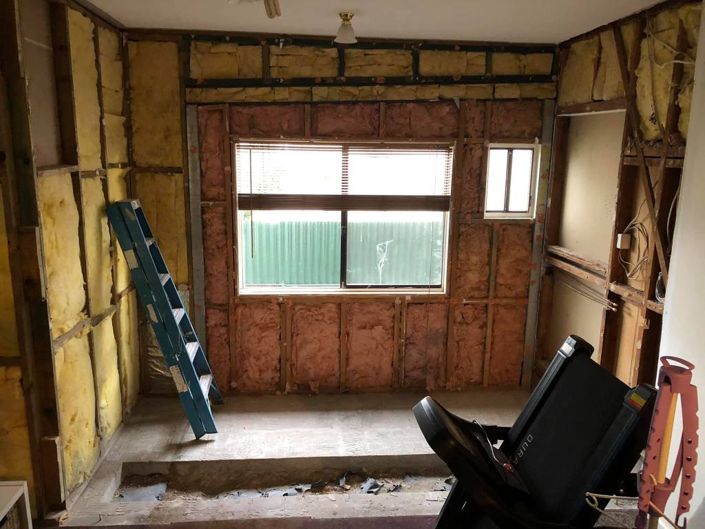 We have started by putting in a second bathroom and laundry, so we have a bathroom to use when the main one is pulled out. The room the laundry is in is very spacious and only a third of the room is used for the laundry, so it will be ideal to fit out with a shower and toilet as well. This fit out required entirely new drainage to be put through, which meant, oh tragedy, the purple tiles had to come up.