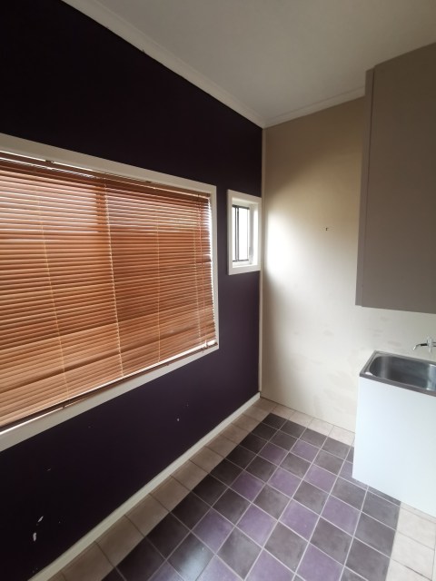 Behold the before shot (below), complete with eggplant feature wall, giant window next to tiny window, stained glass folding door and sink that wasn’t properly plumbed in. It’s important to remember when fitting out any laundry, to get the purple feature wall done before putting the drainage in, right?